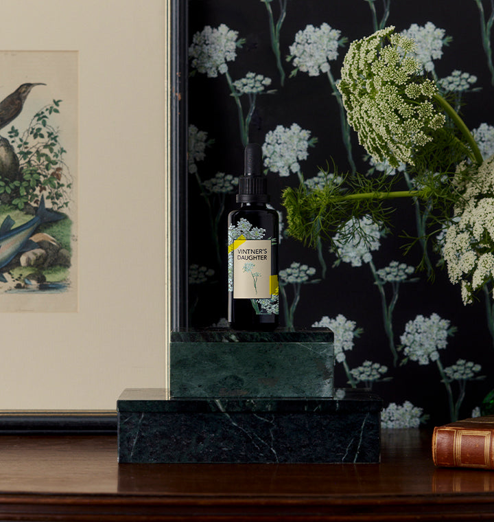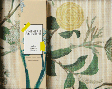 Your bottle arrives nestled in a square of grasscloth wallpaper also designed by Chloe for her exclusive product line, featuring a variation of the same botanical design.
